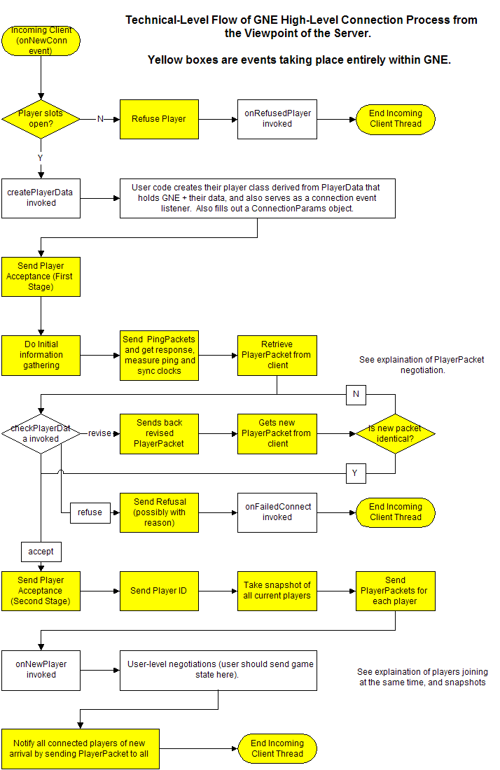 The client starts out sending its PlayerPacket to the server. The server then decides if it likes that packet or not. If it does, it accepts the client. If it doesn't, it modifies the PlayerPacket and sends it back to the client. It may not like it because the name is not unique (i.e. there is already a player "Jason"), and makes a suggestion (for example to change the name to "Jason2"). If the client sends back the identical packet, then the server accepts the client. If it sends back a different packet, the process starts over. This negotiation is done in the user-side code. The server can choose either to allow the client, suggest a different PlayerPacket, or completely refuse the connection outright and refuse the client (the server also knows its ping times and IP address at this time, and it may decide the ping is too much, or the IP is banned, or something in the PlayerPacket it REALLY doesn't like). This process is done in user-code so that the programmer of the game has the maximum flexibility in handling player data.